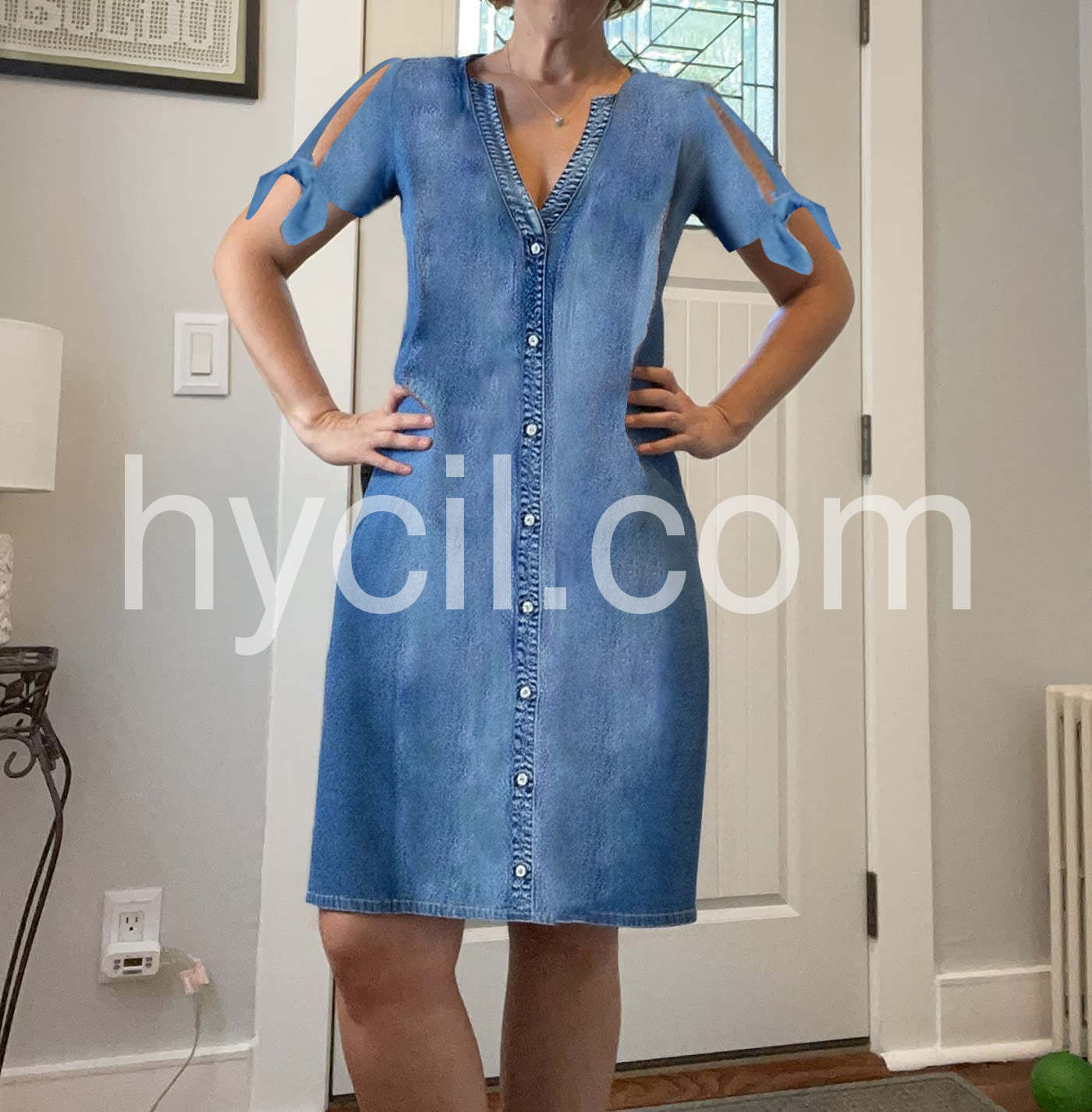 Chambray V-Neck Button Front Split Sleeve Mini Dress