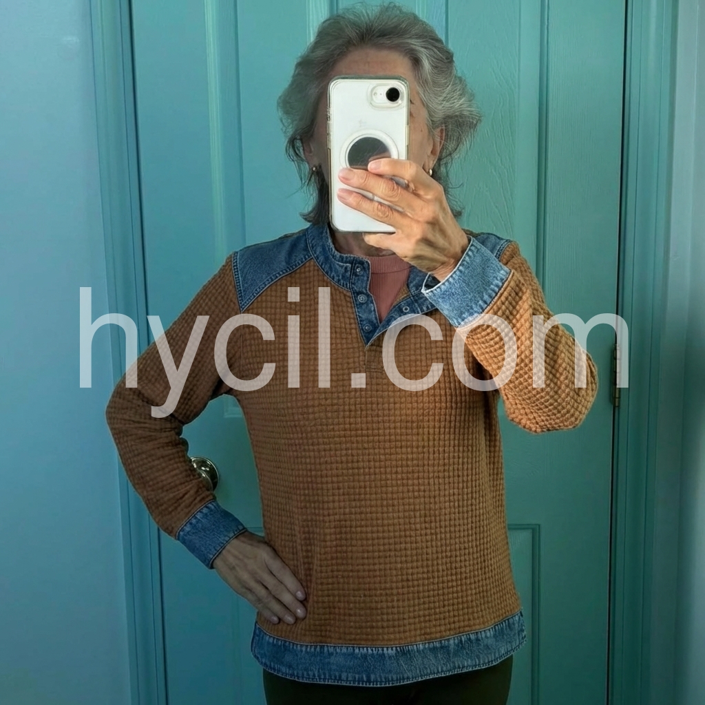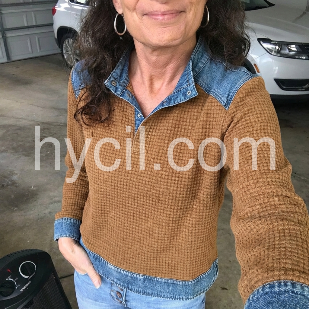 Yes!It runs true to the garment size chart please choose your size based on your measurements.Crafted from premium denim, this long sleeve top features a sophisticated brown color block design that adds visual interest and versatility to your wardrobe. The structured fabric provides durability and maintains its shape through regular wear, while the extended sleeves offer practical coverage. The color blocking technique creates a modern silhouette that works seamlessly with both casual and elevated styling. Perfect for layering or wearing as a standalone piece, this top delivers timeless appeal with contemporary flair.