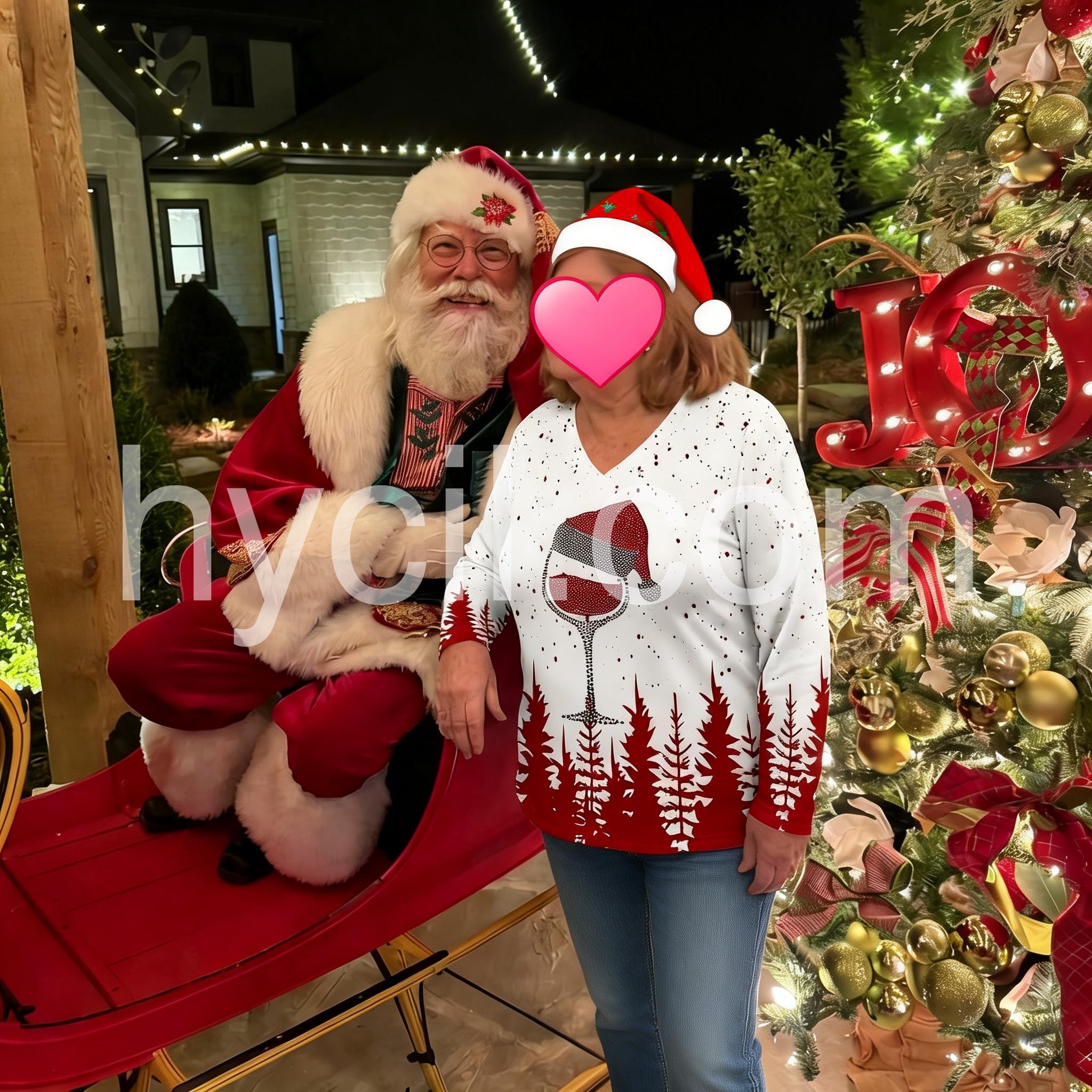 Spread holiday cheer with this long sleeve v-neck top! A dotted mosaic creates a tipsy red wine glass Santa Claus hat print, setting a fun and flirty mood for your next Christmas party. Red pine trees add the perfect backdrop for any time you need a joyful reminder of your favorite time of year.
