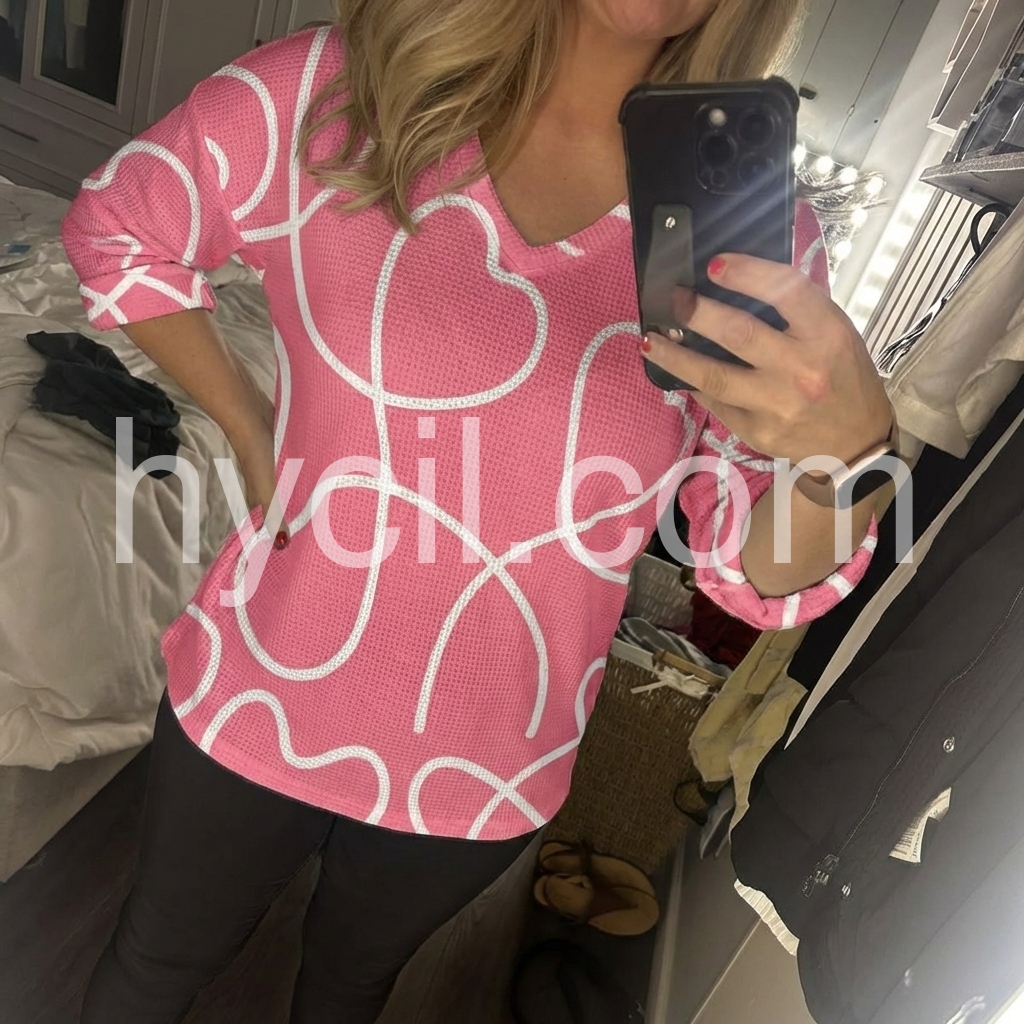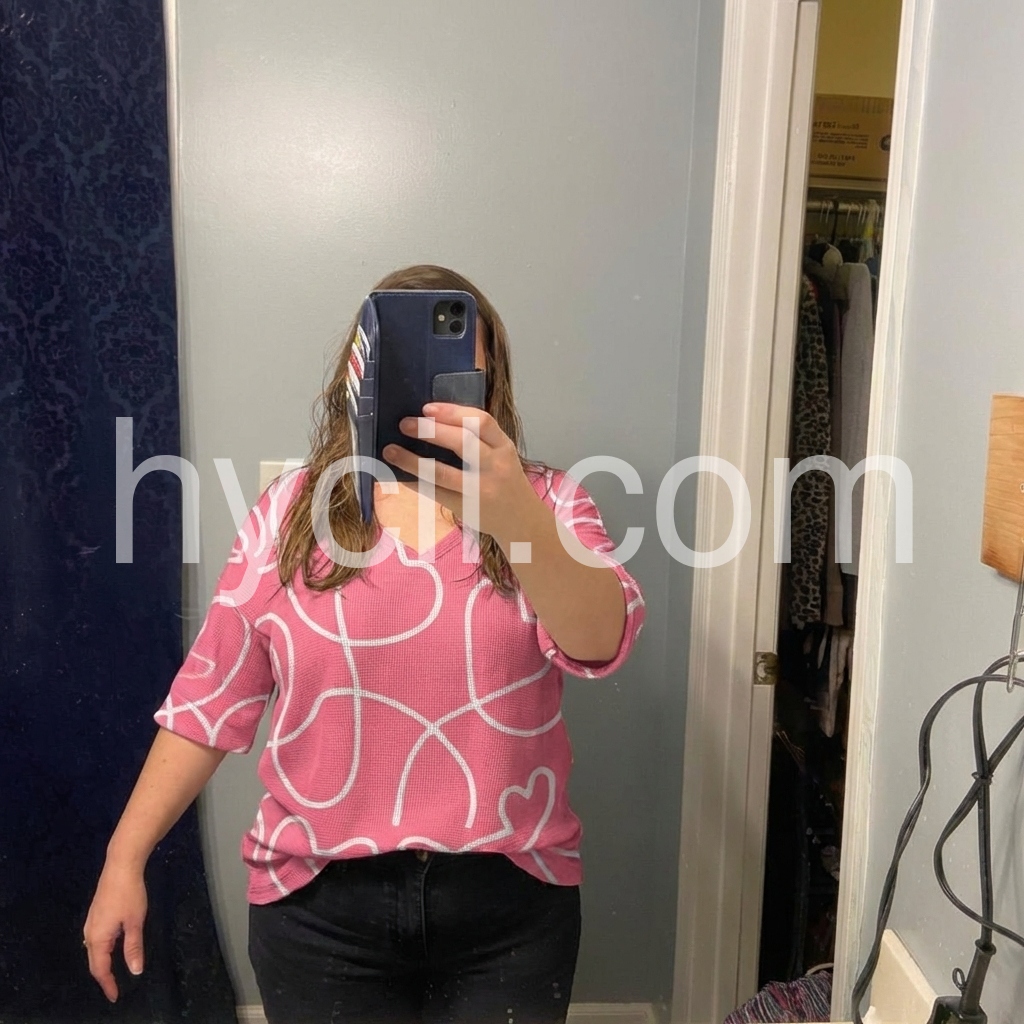 Yes!It runs true to the garment size chart please choose your size based on your measurements.Elevate your casual wardrobe with this refined V-neck top, featuring a delicate heart outline design in soft pink. The flattering V-neckline creates a sophisticated silhouette while the minimalist graphic adds a touch of understated elegance. Crafted for versatility, this piece transitions seamlessly from day to evening, pairing effortlessly with jeans, skirts, or tailored trousers. The gentle pink hue complements a wide range of skin tones and coordinates with most color palettes. Perfect for those who appreciate subtle style details and quality basics that work harder in any wardrobe.