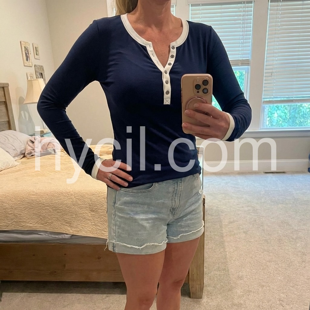 Yes!It runs true to the garment size chart please choose your size based on your measurements.Elevate your everyday wardrobe with this navy long sleeve color block top, designed for versatile styling and modern appeal. The strategic color blocking creates visual interest while maintaining a polished aesthetic suitable for both casual and professional settings. Crafted with attention to detail, this piece offers comfortable wear throughout the day. The long sleeves provide practical coverage, making it an ideal layering option for transitional seasons. Perfect for those seeking quality basics that seamlessly integrate into any closet.