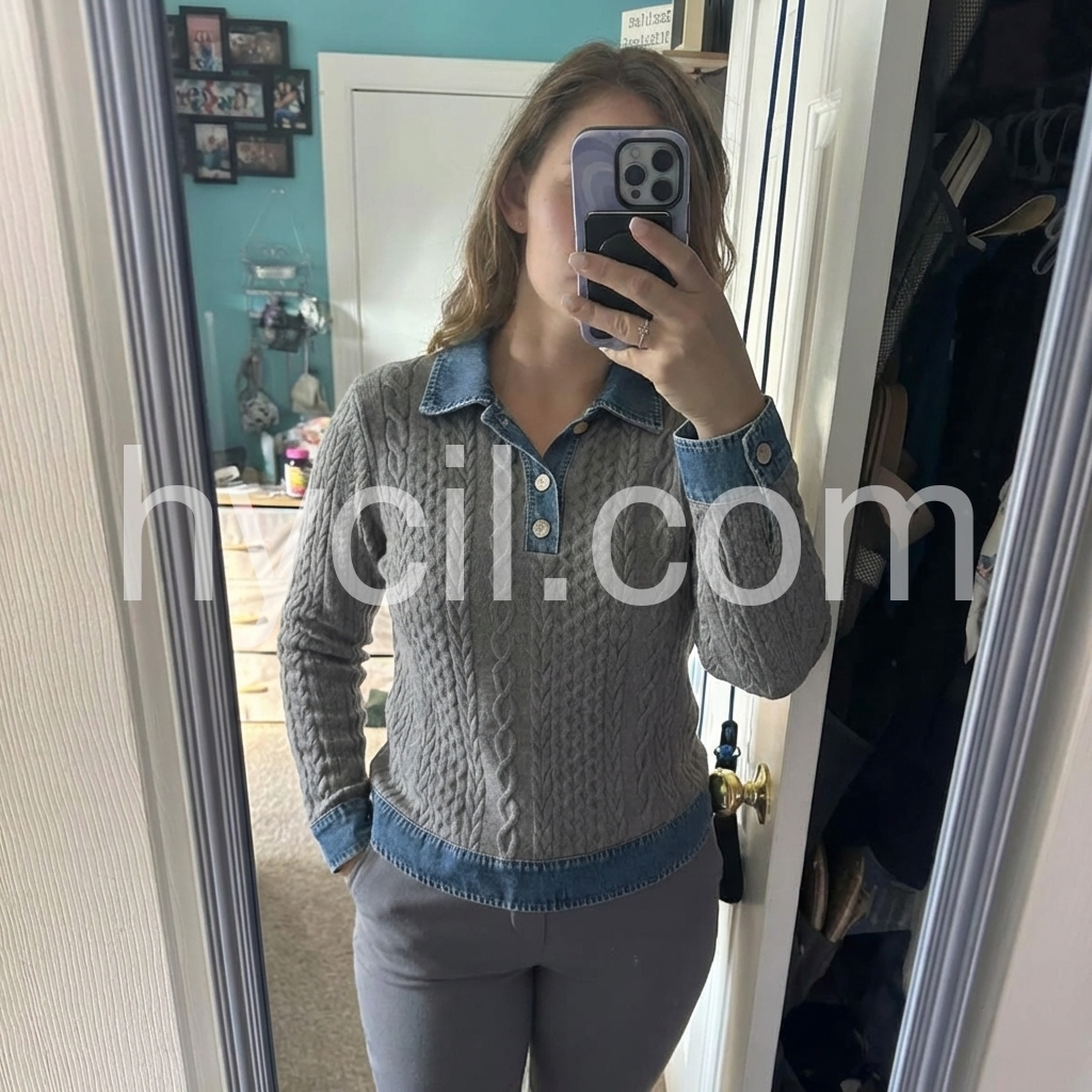 Yes!It runs true to the garment size chart please choose your size based on your measurements.Elevate your casual wardrobe with this sophisticated grey cable knit sweater, featuring a distinctive denim collar that bridges classic and contemporary style. The intricate cable pattern adds textural depth and visual interest, while the long sleeves provide warmth and versatility for layering. Crafted with attention to detail, this piece transitions seamlessly from weekend wear to smart-casual settings, offering the comfort of premium knitwear with refined aesthetic appeal.
