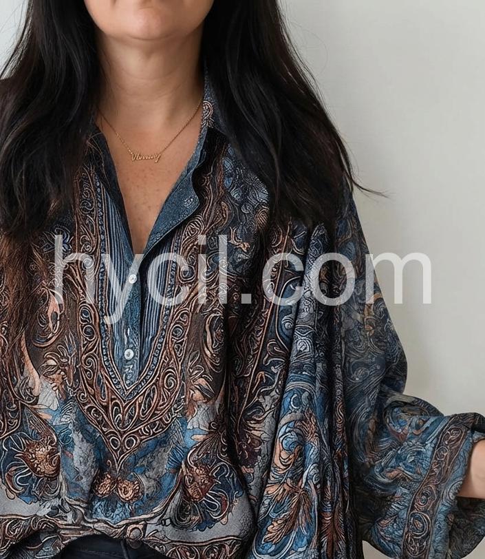Yes!It runs true to the garment size chart please choose your size based on your measurements.Crafted from premium silk, this bohemian blouse showcases an intricate blue print that captures effortless elegance. The relaxed silhouette and flowing fabric create natural movement, making it ideal for layering or wearing solo. Perfect for transitional seasons, this versatile piece pairs seamlessly with denim, linen trousers, or skirts. The breathable silk construction ensures comfort throughout the day while maintaining a refined, polished appearance. A timeless addition to any wardrobe seeking understated sophistication with artistic flair.