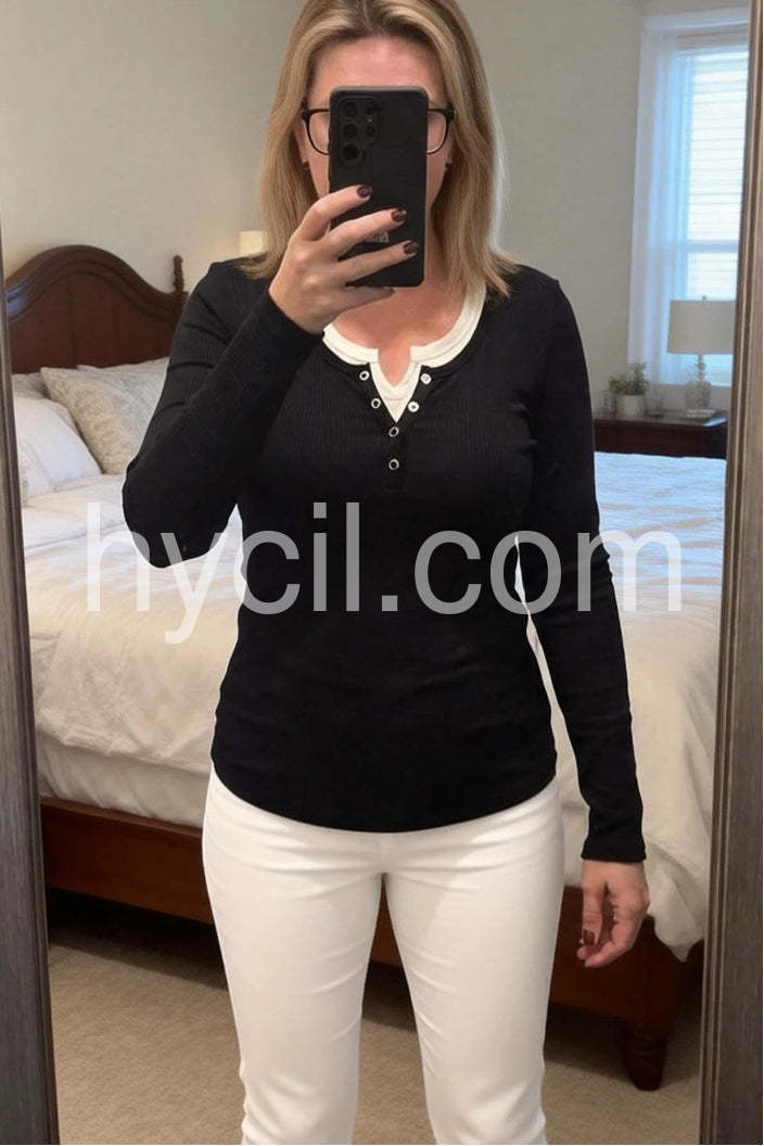 Yes!It runs true to the garment size chart please choose your size based on your measurements.This expertly designed long sleeve top combines classic sophistication with modern versatility. The black foundation is enhanced by crisp white trim framing the collar and hem, creating a refined two-tone aesthetic that commands attention. The structured neckline and tailored silhouette project confidence and professionalism, making it an indispensable piece for contemporary wardrobes. Whether styled with formal separates or casual basics, this top delivers polished results. The quality construction ensures durability and lasting appeal, while the timeless color blocking transcends seasonal trends. An investment piece that anchors any collection with understated luxury.