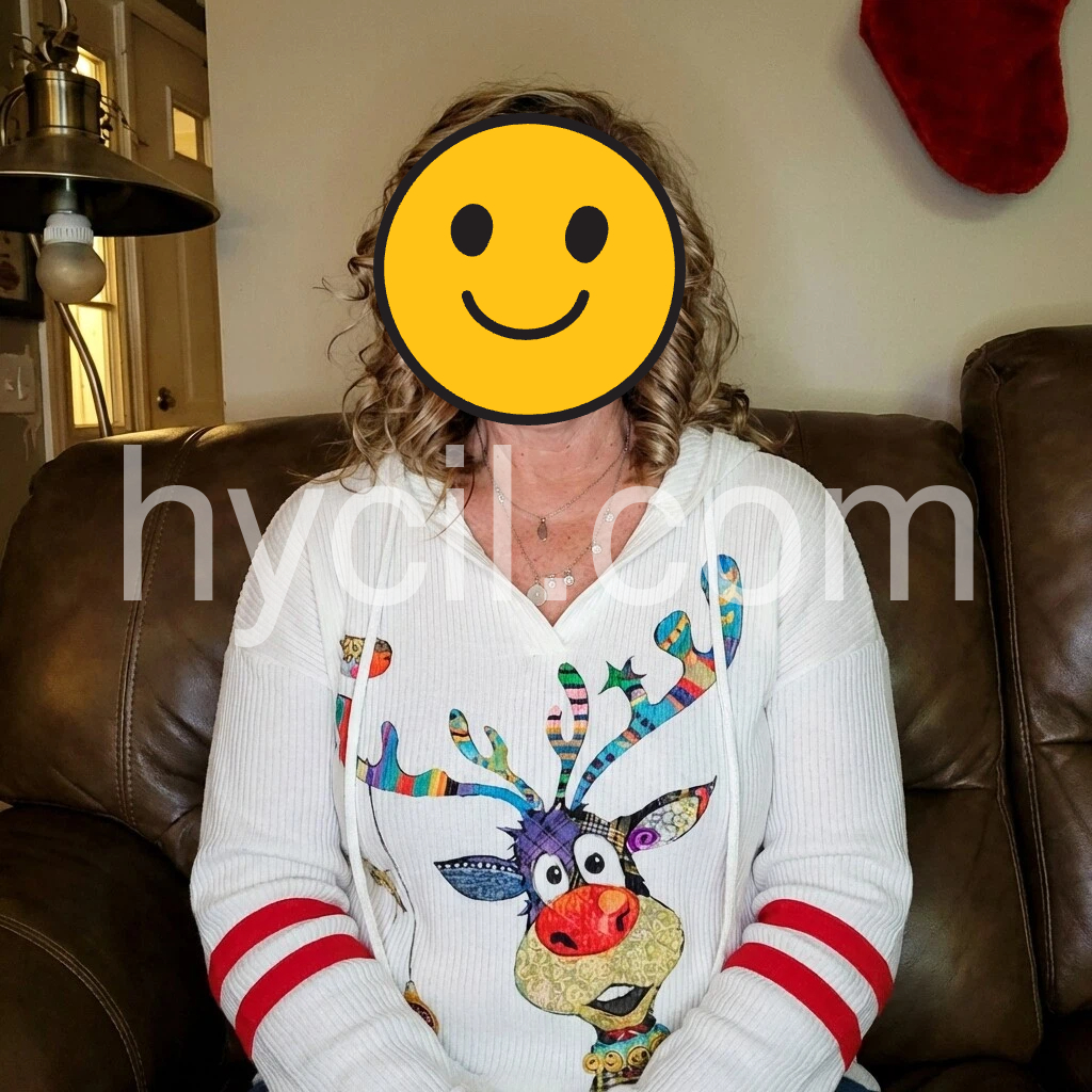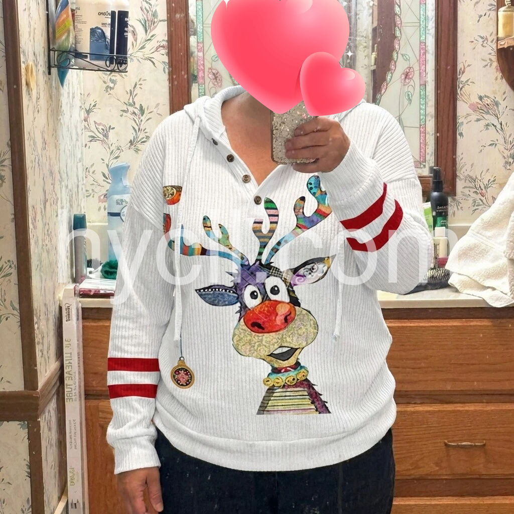 Bring in the winter season with this holiday-ready reindeer top. A white cozy ribbed top with red stripes and colorful reindeer print make this hoodie a cheerful complement to your day or night with its relaxed vibe. A plunging v-neck and buttons on the front give it the perfect amount of detail and chic fit.