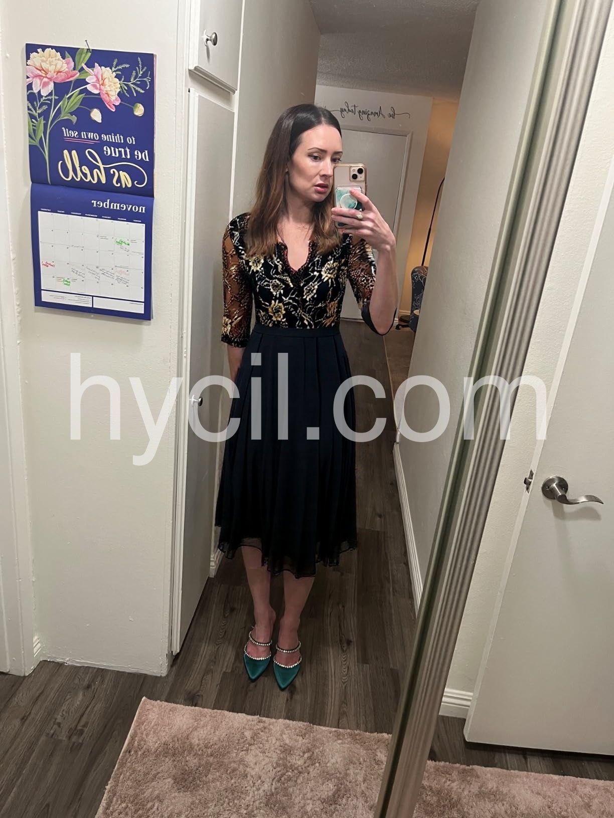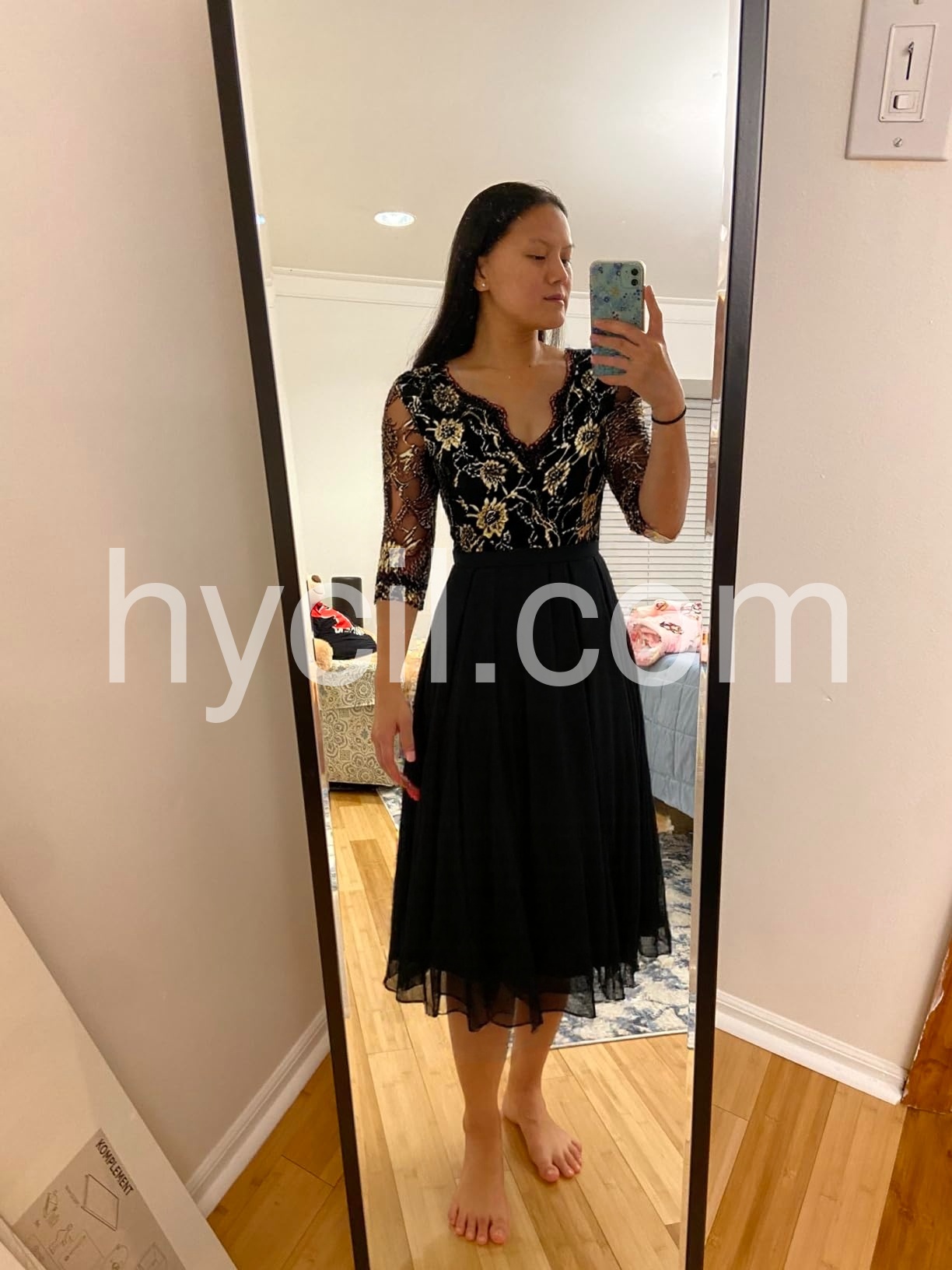 Yes!It runs true to the garment size chart please choose your size based on your measurements.This stylish midi dress features a flattering V-neck design and elegant 3/4 sleeves, making it perfect for any occasion. With its versatile and timeless style, it offers a comfortable and chic look that can be dressed up or down. Made from high-quality materials, this dress is a must-have for any fashion-forward wardrobe.
